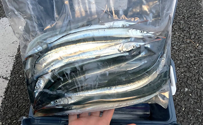 コツをつかんだ私たちは、その後コンスタントにサヨリを釣りあげ、10時から12時半までで50匹ほど釣ることができました。サイズは25cm前後が多かったです。サヨリの群れはどんどんでかくなっていき、ほぼずっと足元を泳いでいるような感じでした。まだまだ釣れそうでしたが、コマセがなくなったので納竿。