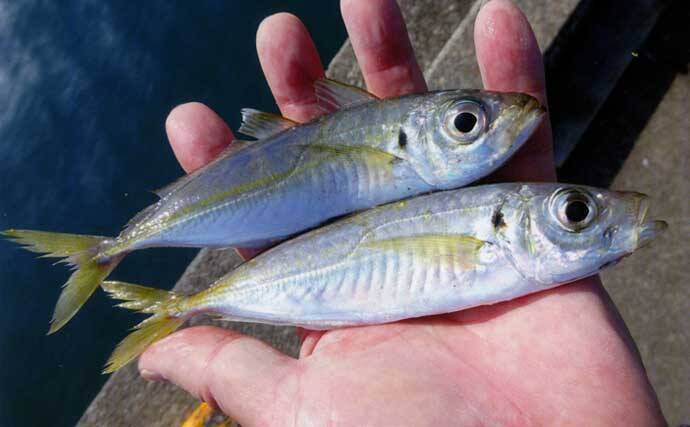 諦めずに投入を続けると、ウキがチョンチョンと振動した。サオを立ててリールを巻くと重量感とともにクイクイと引きが伝わり、海面近くで光る魚体が見えてきた。抜き上げると17cm前後のアジが2匹ピチピチと躍る。アジの顔を見て心配も吹き飛んだ。