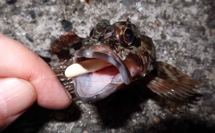 活性が低いカサゴはボトムの障害物にへばりついている。この手のカサゴは、スプリットショットリグでボトムをじくじく探るとよい。