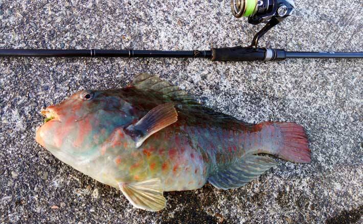 昼食後は漁港をランガンしてイガミを探していく。なかなか反応が得られないが、夕方に行った漁港で岸壁沿いに泳ぐイガミを発見。ウキ釣りではやりにくいのでルアーロッドに持ち変え、岸壁沿いに泳ぐイガミの目の前に入れるとあっさり食い付きヒット。