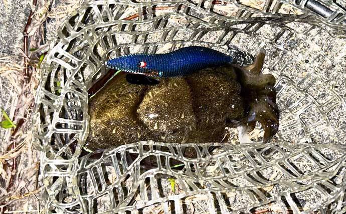 コウイカの好むであろうコースを想定し、任意のポイントで食わせの間を入れます。すると、待望のヒットです。浮いて来てビックリです。まさかのタモ入れサイズです。狙い通り、港内の穏やかな場所に身を潜めていた様子です。