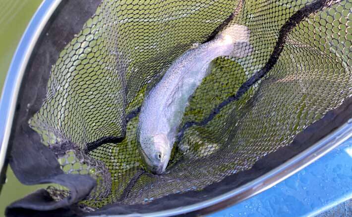 夕方は釣れるという読みが当たったのか、2投目で25cmほどのニジマスが掛かってくれました。反応があった水深は、前回と同じく底より少し上がった層。しかし反応がずっと続くわけではなく、イマイチな状況が続きます。反応があってもフッキングしないことも多く、魚に遊ばれている感がありました。