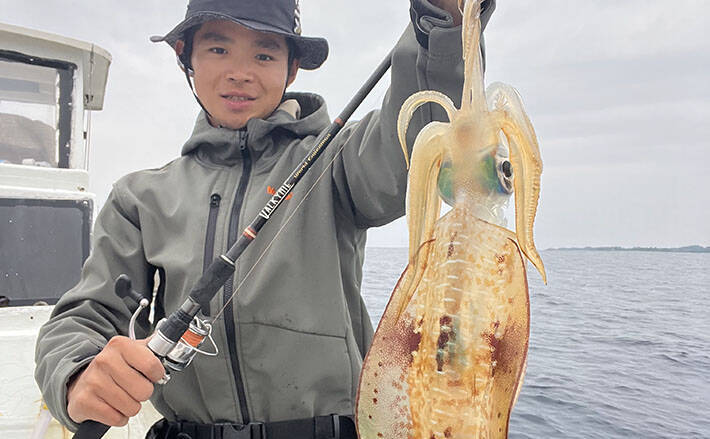 後半はアオリイカ狙いに切り替え、水深20mから80mまでをドテラ流しで探っていきます。水深20m~80mをドテラでサーチ。まずはレンジを広く探り、反応のある水深を探していきました。ボトムから5m以内のレンジを入念にしゃくってストップを繰り返します。基本的にはストップ中にアタリが出やすいですが、フォール中にもアオリイカが抱きついてくる時があるので注意が必要です。