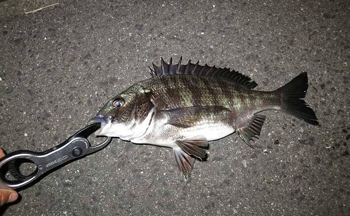 ジグヘッドにエサを付けると、ワームの場合よりも飛距離が落ちるので、ポイントは近距離に越したことはない。また、クロダイ、マゴチが混じるところはバスロッドを使うなり、ラインを太くするなり、ジグヘッドも重くしてタックル全体のパワーレンジをアップするとよい。