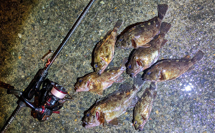 雨が止んでからの雨が降り出すまでの4時間釣行となりましたが、ライトソルトゲームとエギングで濁りがある水潮の中でもガシラやコウイカと出会えて良かった。濁りがあると根魚でもイカでも夜光系がヒットカラーでした。