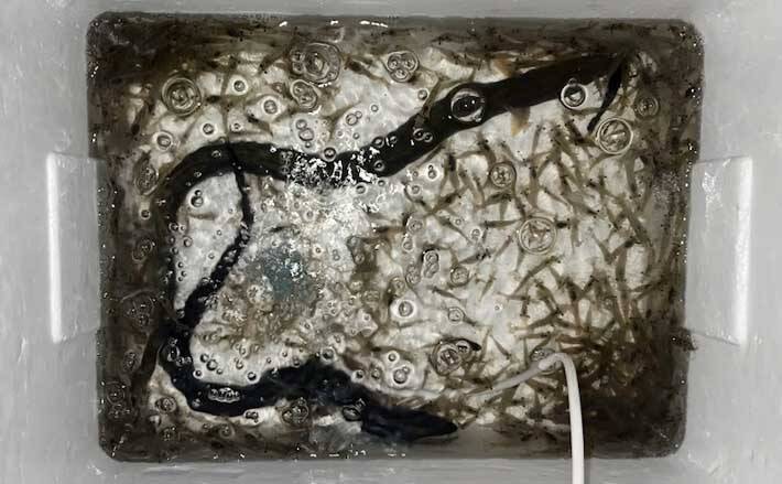 大量のエビが入った発泡スチロールに60cm以上の真っ黄色なニョロニョロ君をドボン。飛び跳ねて脱走したエビを捕まえるのが大変だった。
