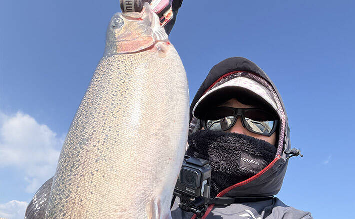 鼻先まで見にきたときにチョンとアクションすると、反転した瞬間に食ってきた。一気にドラグが鳴る。ロッドを強引に立ててなんとか待望の1匹目をキャッチ。大きな魚体は、養殖ならではのサーモンだ。