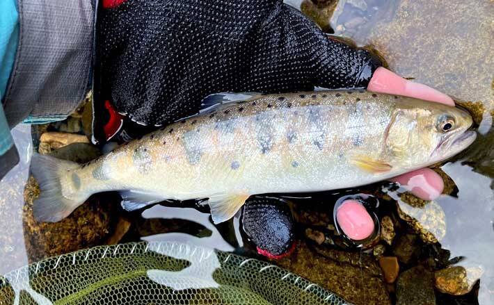 目の前で食った!アドレナリンが出る瞬間だ。いいサイズだ。ネットイン。25cmほどのヤマメ。
