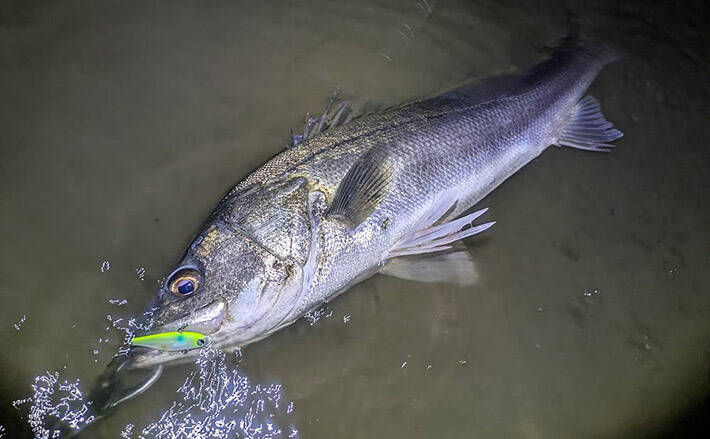 水面を見ると小さな波紋が集まっている場所を発見。上流側にキャストし巻いてくる途中に狙っている場所を通過するようにルアーを泳がせます。レンジをキープしながら狙ったコースに差し掛かった時にズシン!と抑え込むようなバイトがありました。フッキングを決めると全く浮かない!ぐんぐんと頭を振る感じで8割シーバスと確信です。
