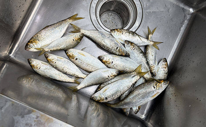 ひと通りBBQを食べ終わったところで釣りの準備を開始。既に湾内に信じられない数のコノシロがボイルしていて、タモを出せば、ひと救いで5尾以上採れる始末である。