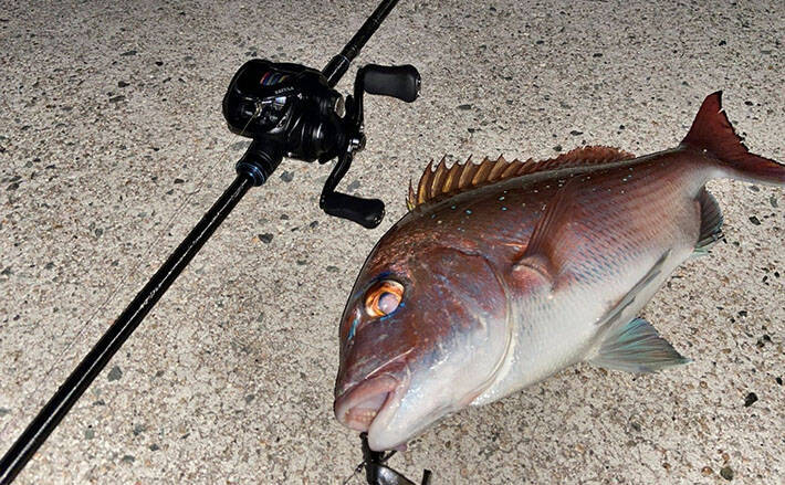 引きと魚の動きから大体予想は付いていたが、薄っすらと月明かりに照らされたシルエットが見え始め上がって来たのは、やはりマダイだ。足元まで寄せ慎重にタモでランディング。