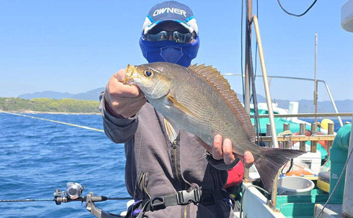 一般に大型は群れの頂点にいるとされるので、船長の指定ダナの上を狙うようにしているとガツンとロッドを引っ手繰り、ドラグを引き出す魚がきた。これは尾長グレかも知れないと慎重になったが、浮いてきたのは茶褐色のイサギ。