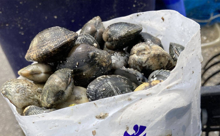このセオリー通りに広く探っていくと、地質が黒い粘土層へと変化。その直後、大粒のアサリが姿を現した。