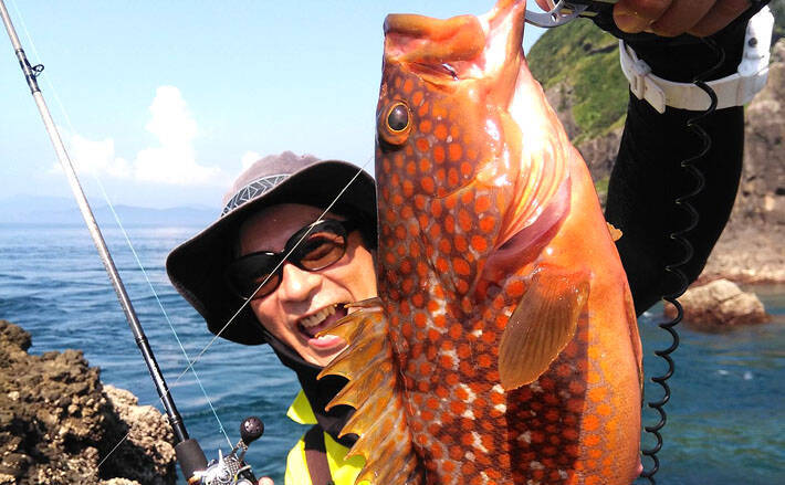 あとはちょっと移動をして強引に浮かせると、40cmには届かなかったが良型のアカハタだった。「めっちゃ強いやん!さいこー」。