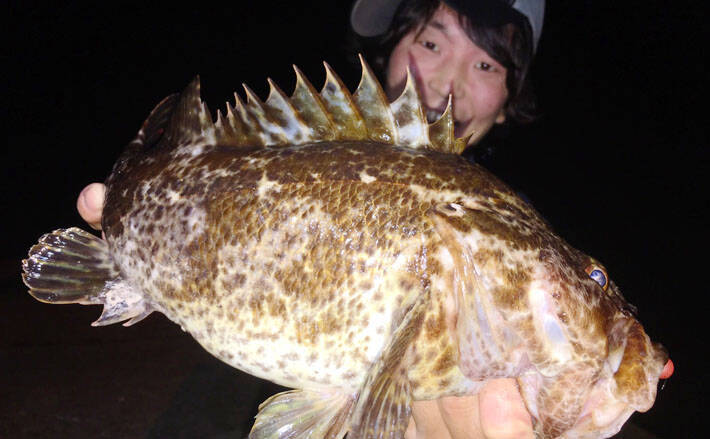 まずは、テキサスリグを使った根魚釣り。主にキジハタ、タケノコメバルがこの時期釣りやすいターゲットである。狙いとして漁港周りの藻場、カケアガリ、テトラ周辺などがメインフィールドとなる。