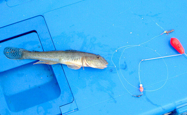 アクセントのある場所、例えば捨て石の周り、土管の出ている場所(水が流れ込んで、掘れて溝状になっている)、ブロックの護岸の継ぎ目の前などを移動しながら狙って、正午までにハゼは31尾。型は12cmまでと小さかったが、釣況は上向いてきたようである。
