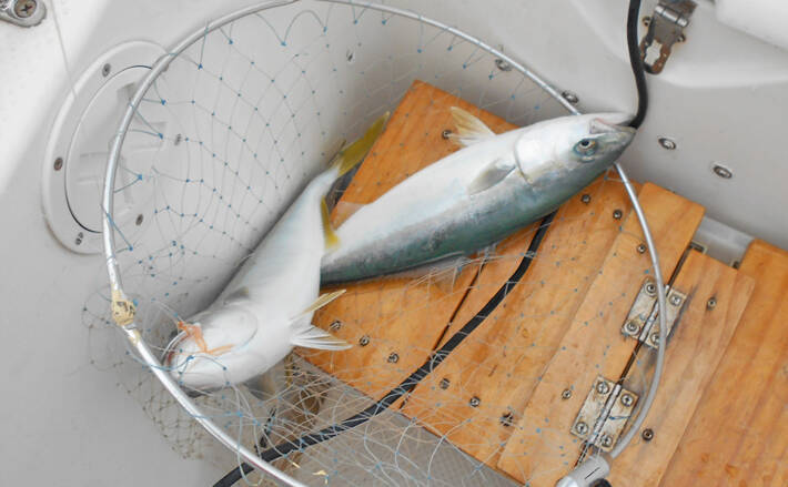 このサイズで8号ハリスならば、切れる心配はないので、強引なやり取りも問題ありません。小ハマチでもダブルで掛かるとおもしろく、これがチョクリ釣りの醍醐味で、3匹つけば鯉のぼりです。