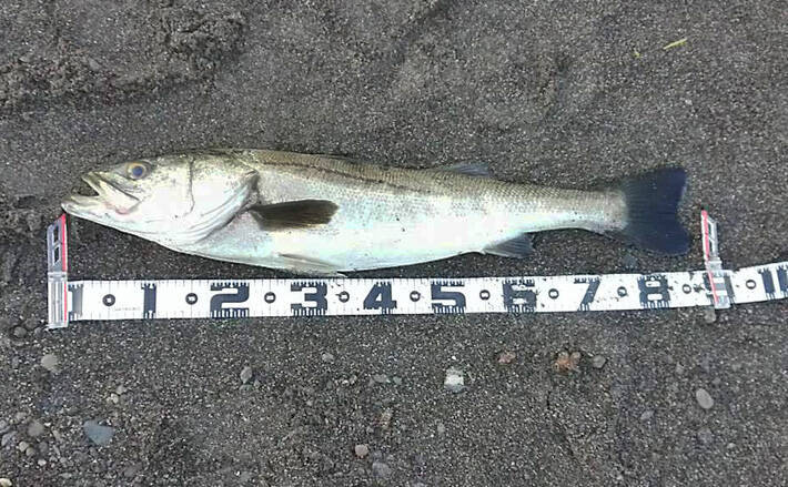ランディングして浜に乗ったシーバスはランカーサイズ間違いなしという風格を持ち、サイズを計測すると87cmだった。コノシロパターンでは大型のシーバスが釣れる事も多く、迫力のある釣果をあげることも可能だ。