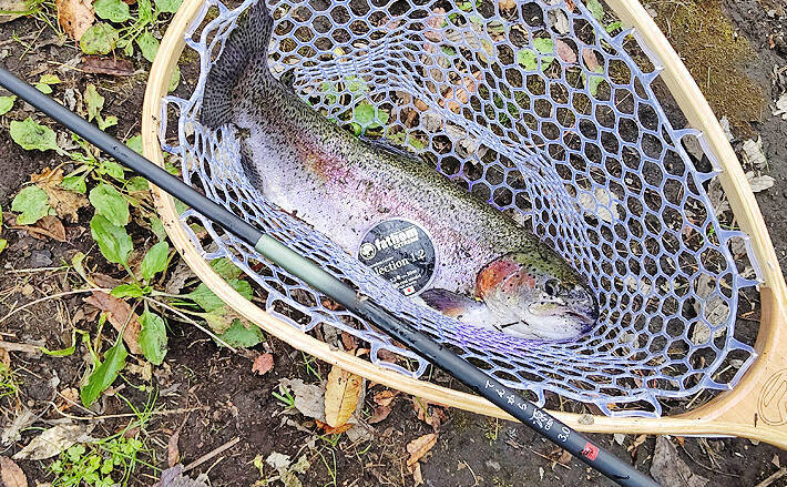 バシッとアワせるとかなりの重量感とともに今までの鈍い動きが嘘のように猛烈に暴れる。無理をすれば切られるリスクもあるので竿をしっかりと立て、弾力を活かしてゆっくり寄せてくる。何度も強い抵抗を見せてやっとのことでネットインできたのは、45cm程のグッドサイズのニジマスだ。