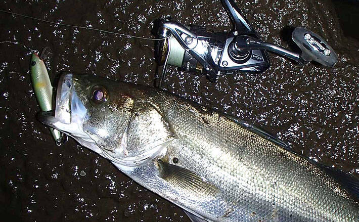 午前9時、ショートジャークを繰り返していると、自作シンキングミノーを押さえ込む待望の手応え。水面下で銀鱗が光り、40cmクラスのシーバスをキャッチできた。