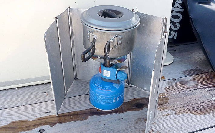 野外では無風と思っても、実は案外、風が吹いていて熱効率が悪くなる。そこでコンロ部分だけでも風防があれば熱が効率よく鍋に伝わると言う訳だ。風防があるのとないのとでは、お湯が沸く時間に大きく差が出る。と言う事は、早く沸かす事ができれば、コンロの燃料も節約できる。
