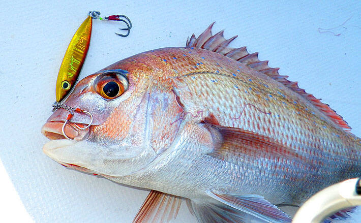 山立てで同じ場所を流すとお祭り騒ぎの入れ食いモードになった。ボトムで誘えばヒット。それもマダイ交じり。