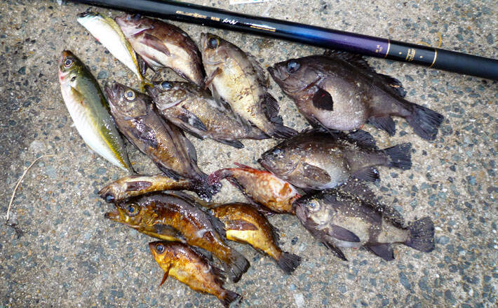 まだまだこれからだと素早くモエビを交換して投入すると、一気にサオ先が海中に絞り込まれた。 良型のようで浮いてこない。 そのままグイグイと持っていかれるだけだ。 しかしサオが長い分、力が分散するのか徐々に浮いてくる。 取り込んだのは20cmのメバル3匹。