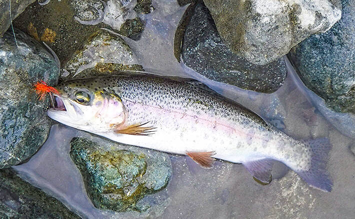 連続ヒットを楽しんでいるとゆっくりと浮上した魚体がフライを押さえ込む。釣れたのは35cmオーバーのニジマス。