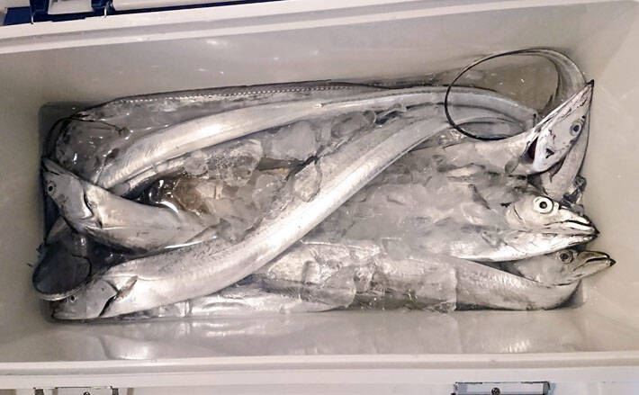 3投目を投入した時にトラブルが起きた。隣の人が抜きあげたタチウオが筆者のPEラインに直撃し切れてしまったのだ。タチウオの腹側と背ビレにあるギザギザや鋭利な牙では、ラインなどひとたまりもない。