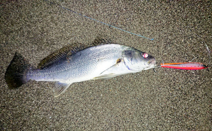 コツンコツンと竿先を叩くような小さな感触が伝わってきた。対オオニベ用の強靭なタックルの為、小型の魚では竿はほとんど曲がらない。テンションをかけ続けるため、波打ち際から離れながらリールを速巻きし、浜に上げた魚は何とオオニベの若魚だった。