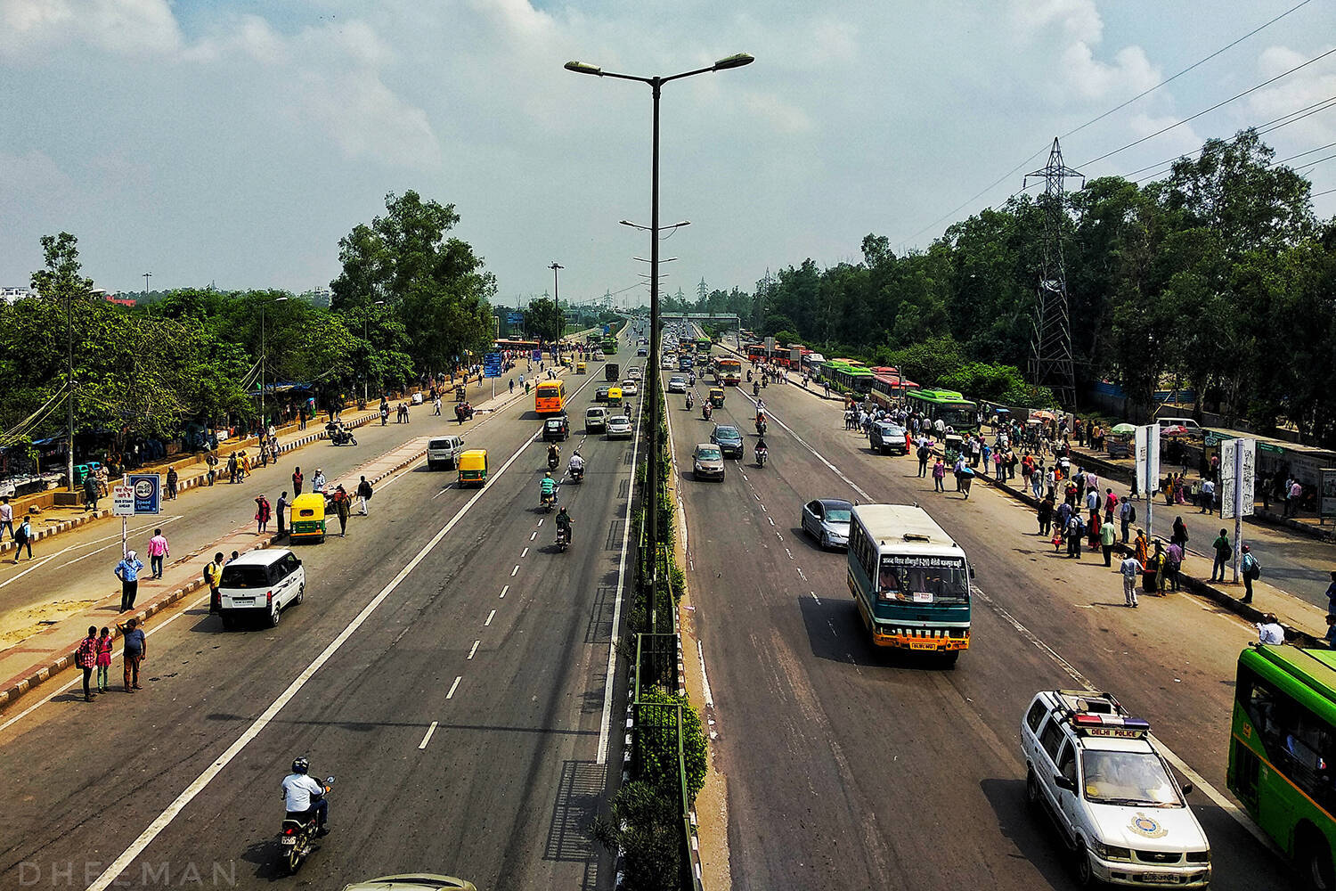 夕方に通りかかったときには渋滞がもっともヘビーだった時間帯なので、だいたい片道三車線分ぐらいあるところ(白線がほぼ完全に消えていた)を、5車ぐらいが横に並んで走っていた(いわゆる「インドあるある」で、ほかの道路ではさらに路肩、そして路肩横の荒れ地まで車線が広がっていった)。