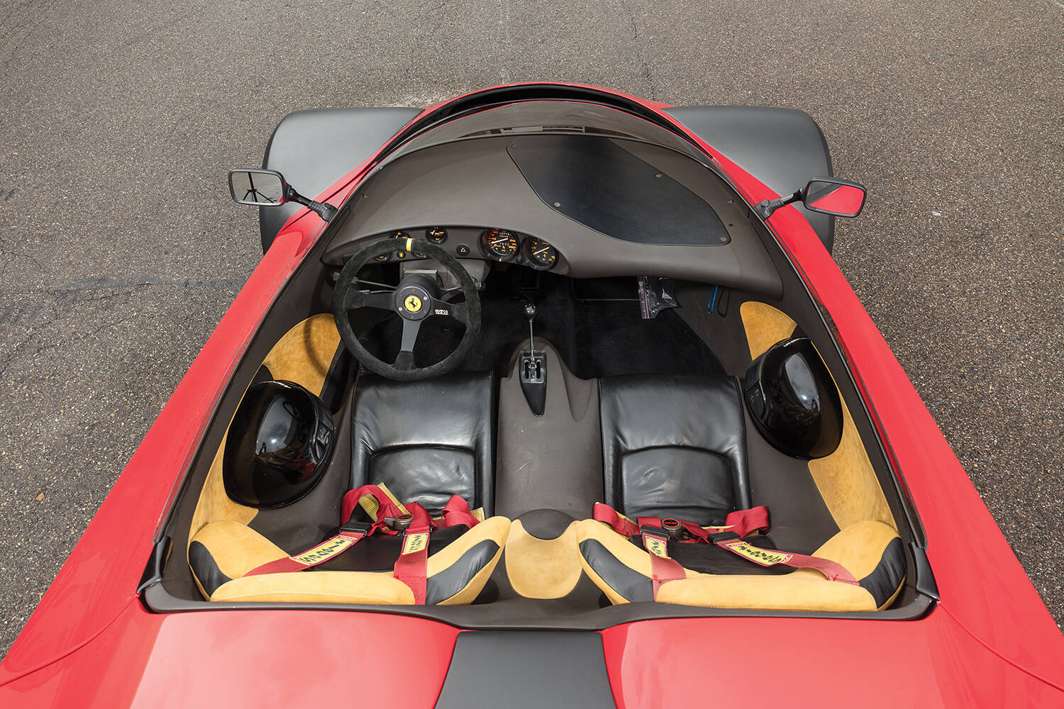 コンシソは、フェラーリ328GTSをベースにしていますが、強いて共通項を探すとしたらオープンルーフを採用していることくらいでしょうか。それとても、GTSはデタッチャブルルーフが付属しますが、コンシソにはソフトトップはおろか屋根と呼べるものは一切用意されていません。そればかりか、ドアすらも省略されており、乗員は太いサイドシルを跨いで乗り込む仕様となっているのです。