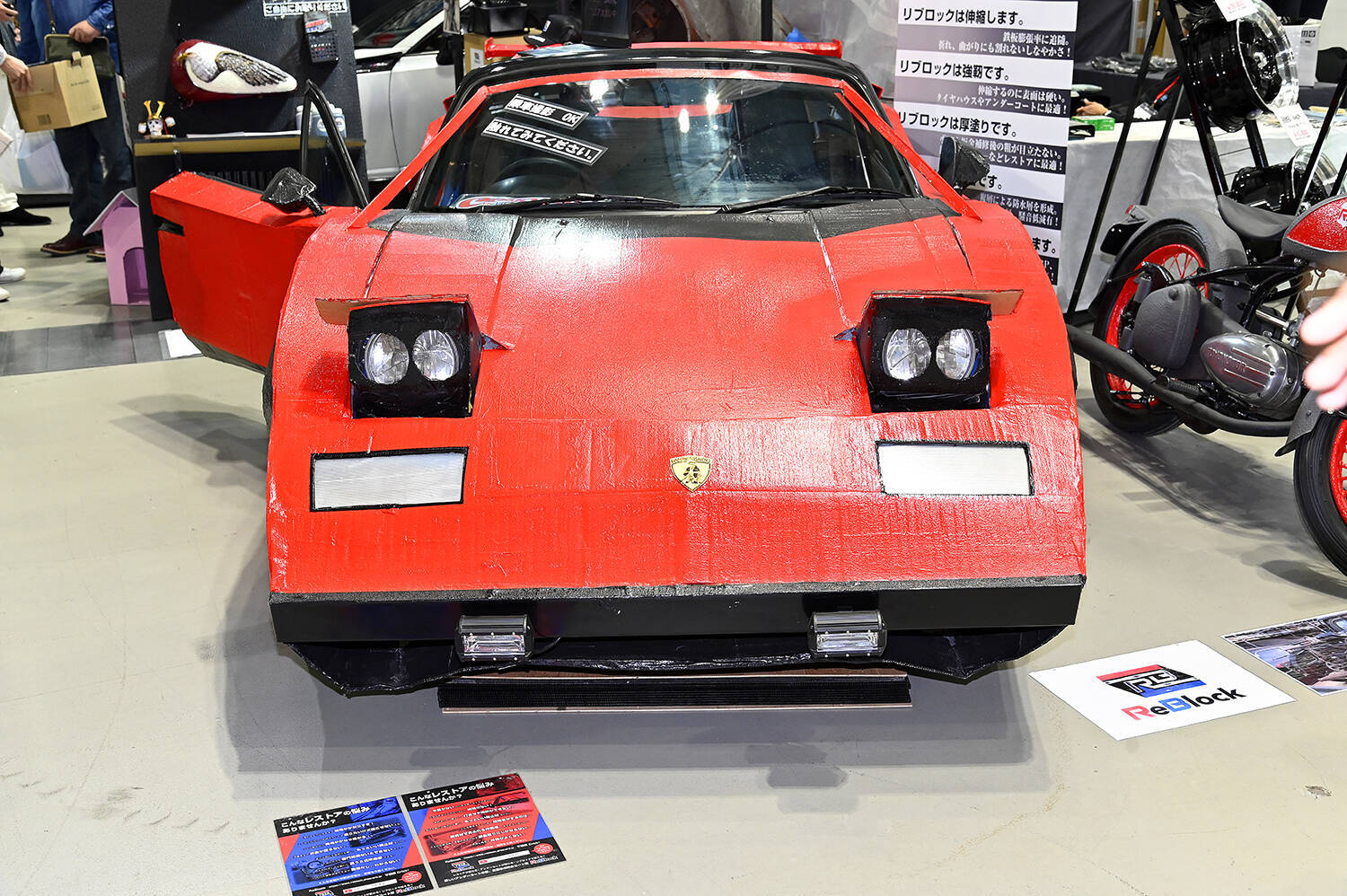 出展社は茨城の「リブロック」というショップで、元々は板金・修理もお手のものというレストアガレージだ。ダンボールを曲げて張り合わせただけでも、エッジの効いたウェッジシェイプは再現可能で、ベース車がNA型のユーノス・ロードスターだけに、リトラクタブルライトまで忠実に再現されている。ダンボールのカウンタックというわけだ。それにしても、どうしてダンボルギーニを作ったのか? その理由には、板金レストアを手がけてきたからこその裏話が隠されていた。