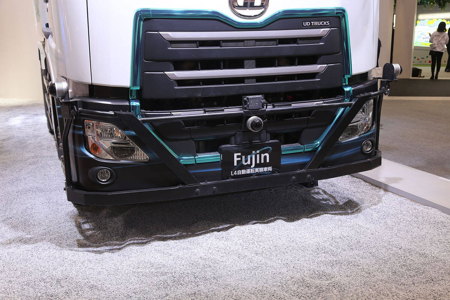 同ブースでとくに目を引いたのは、ルーフとバンパーに特殊なセンサーを装備した大型トラック「クオン」のダンプ。じつはこのクルマ、自動運転技術の実証運転を行なっている試験車で、「Fujin(風神)」の名称が付けられている。ちなみにUDには「Raijin(雷神)」と呼ばれるクオンベースのハイブリッド実験車もあり、こちらは2030年までのフル電動トラック量産化に向けて開発した車両だという。