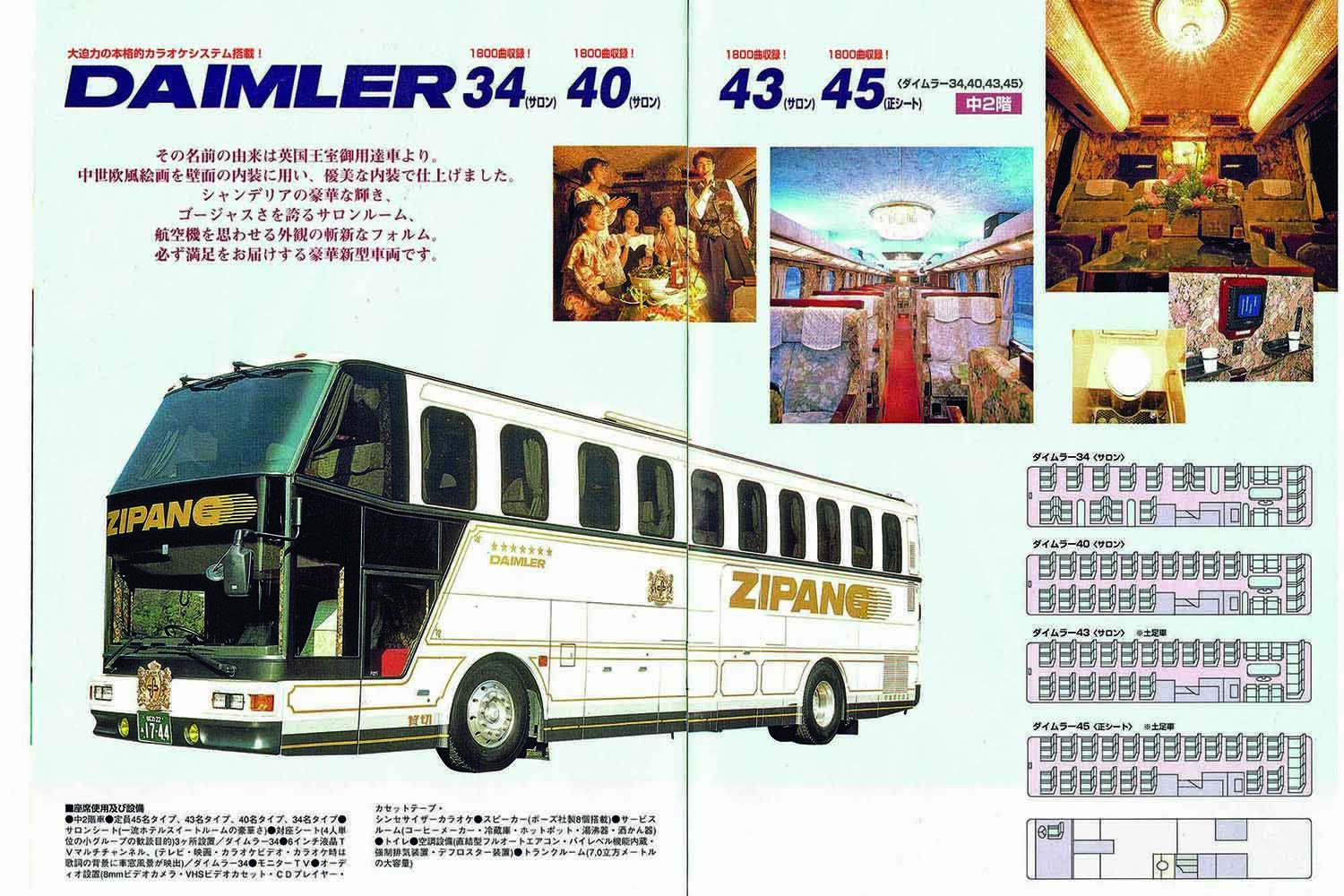 サロンバスが現役の観光バスとして活躍していた当時、その代名詞としても注目を集めていたのが大阪府と岐阜県に拠点を持っていた「中央観光」のバス。1980年代には「JIPANG(ジパング)」のブランド名でフラッグシップ車両の「DAIMLER(ダイムラー)」を始めとする豪華サロンバスを多数運行していた(同社は2001年にはその歴史に幕を閉じている)。当時もいまもデコトラ乗りたちにとっては中央観光のバスが永遠の憧れだ。当時の車両に装備されていた「19当時物」のシャンデリアを探し集めたり、車両そのものを見つけてレストアするユーザーも非常に多い。また彼らは、自分たちが仕事で使うトラックの内装にもこれらサロンバスのパーツを多用。雰囲気もそれらをモチーフにして施工している。