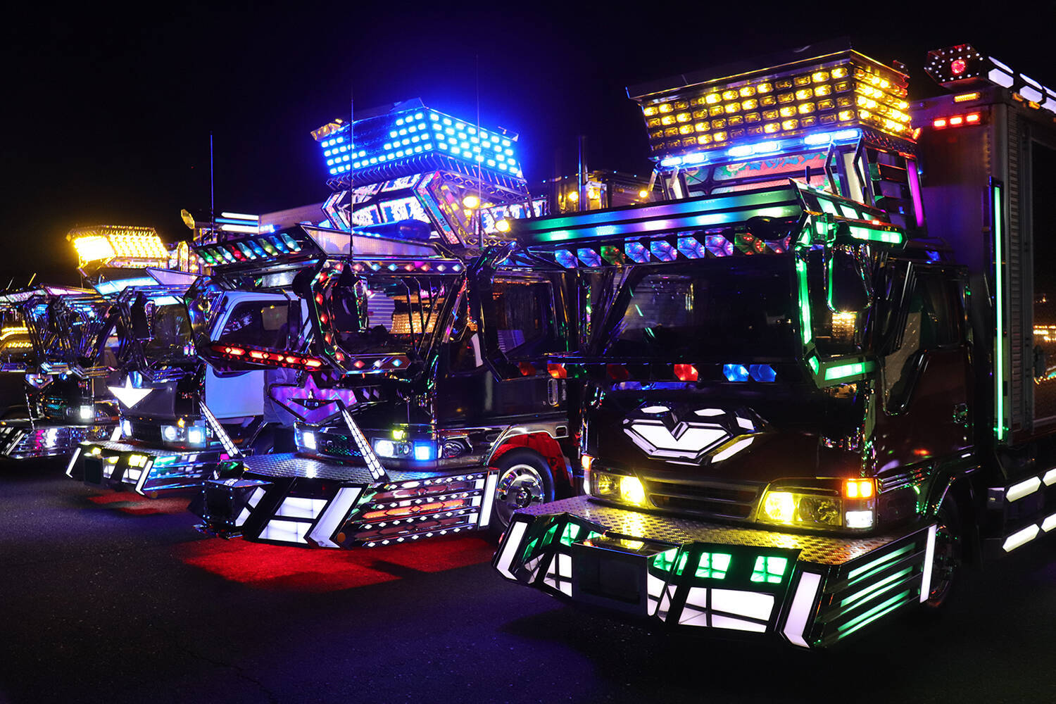 日本独自のカスタムトラック文化であるデコトラ。近年では公道を走っている車輌が少なくなったとよくいわれるが、市場や冷凍倉庫街、工事現場などトラックが活躍する現場では日常的に見かける。ステンレスや鉄&メッキで作られたバンパーやシートデッキなどの大型パーツをまとい、無数のマーカーできらびやかに飾られたその姿は、日中も夜も強烈なインパクトを放ち、子どもから大人まで多くのギャラリーたちを魅了してくれる。
