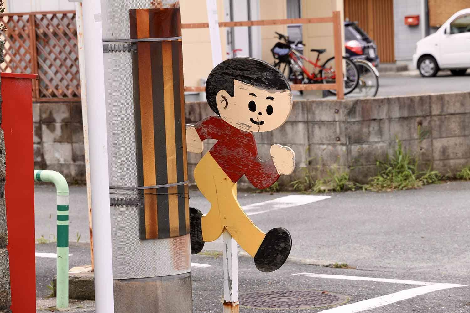坊主頭のまん丸顔に丸い黒目と低い鼻と一文字の口という顔、赤いシャツに黄色いズボンというビビッドで目立つ服装で走っている姿の立て看板は、それを意識しながら走っていると、けっこういろんなところで見かけるほど普及しています。