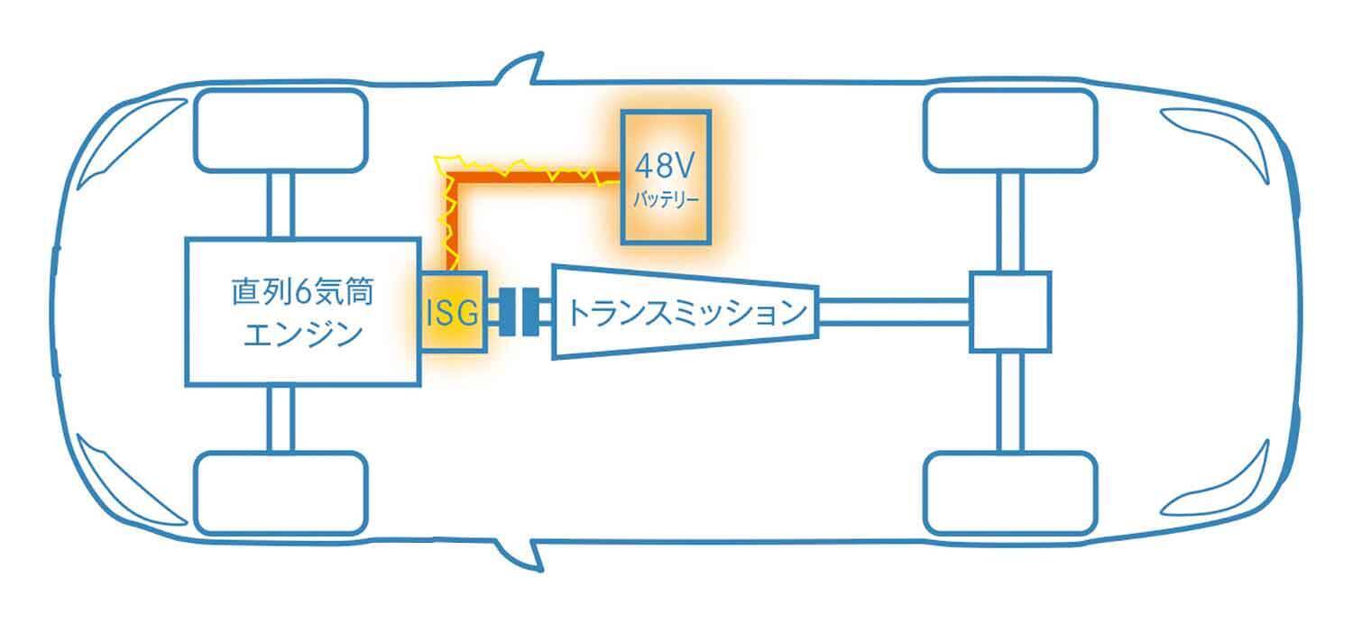 また、エンジンとベルトでつながり発電を行うパーツを、ISG(インテグレーテッドスタータージェネレーター)と呼ばれるタイプへアップグレードして、それによって減速エネルギーで充電したり、加速時にはエンジンをアシストしたりするタイプをマイルドハイブリッドと分類することもあるが、ISGがマイルドハイブリッドの絶対条件というわけでもない。