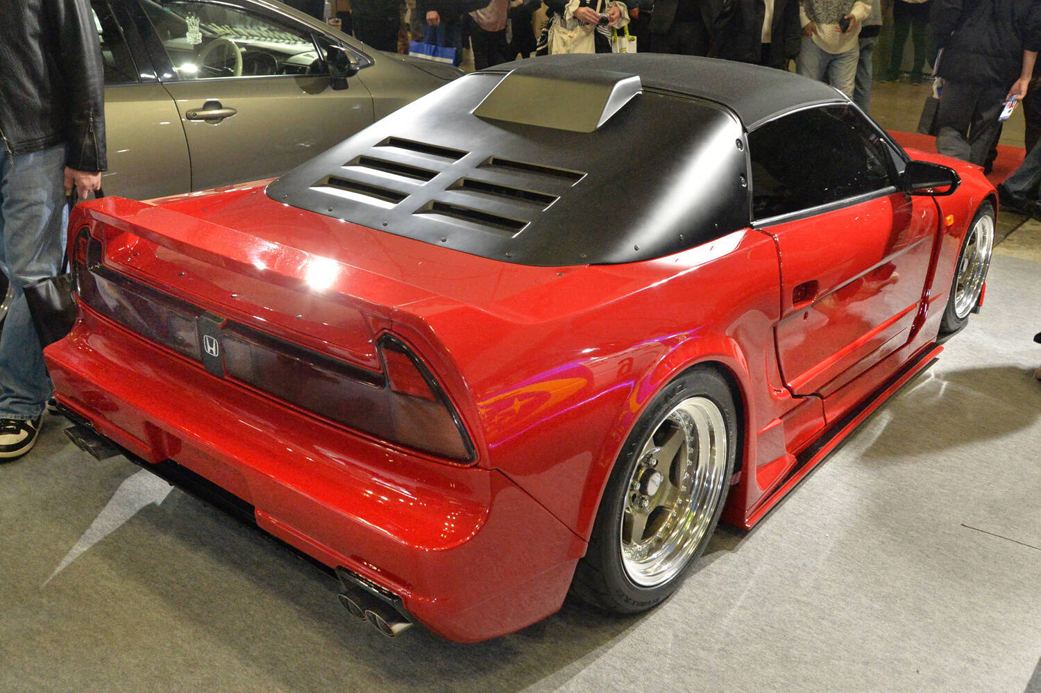 実際に来場者のなかからも、「NSXだ! ……だ……だよね?」という声が聞こえてきました。それくらいの完成度で仕上げられたこの車両は、新潟の「WISESQUARE」が製作した「miNi SX660」という車両で、見たまんま、「ホンダNSX」オマージュの外装コンバージョンキットをまとっています。