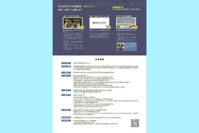 応募方法はロゴを探して写真を撮り、アンケートの回答とともに写真をキャンペーンサイトにアップロード、その画像にハッシュタグ「#goodyearを探せ!」とキャンペーンサイトのURL「https://www.find-goodyear.com」をつけて自身のSNSアカウントに投稿すると申し込みが完了する。