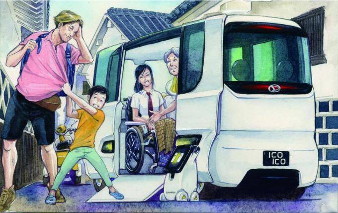 イコイコは電気自動車の自動運転タイプとなるパブリックトランスポーターだ。車名は「行こう」に由来し、細い道などでもスイスイ移動できる車両サイズで、ファーストワンマイルやラストワンマイルで活躍できるようにした。車椅子や大きな荷物を持った旅行者などの乗り降りを考えた格納式のスロープを搭載している。