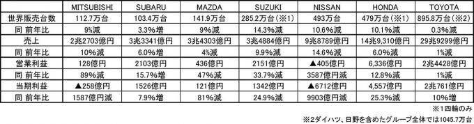 世界販売台数(ホンダとスズキは四輪だけの数字)は各社とも減っていますが、ここで基準とすべきは6.9%という数字になります。というのも、2020年3月期における全需(世界の合計販売台数)は8573万台で、これは前年比6.9%減だからです。つまり、6.9%より多く減っているメーカーは新型コロナウイルスの影響に関係なく販売台数は減っていたといえますし、それよりも減少幅が少なければ新型コロナウイルスがなければよい結果につながっていた可能性があるといえます。