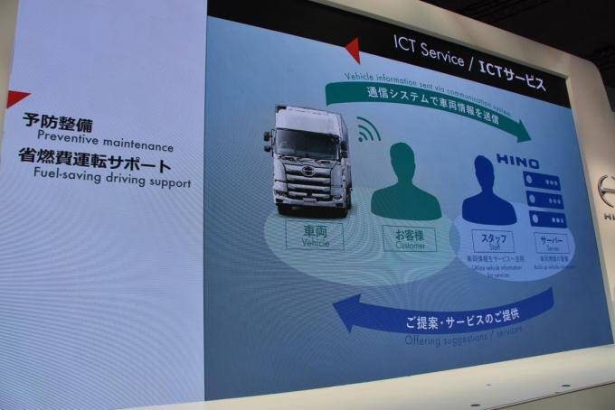 2019年のモーターショーでは、出展メーカーがこぞってデモを行っていたことからもわかるように、じつはトラックなどの商用車でもコネクト技術はかなり普及している。ただ、その内容は、長距離運転で疲れたドライバーを音楽で癒やしてあげたり、マップで経路を表示したり、渋滞情報を提供するといったものではなく、乗用車とはまったく違ったものになっている。