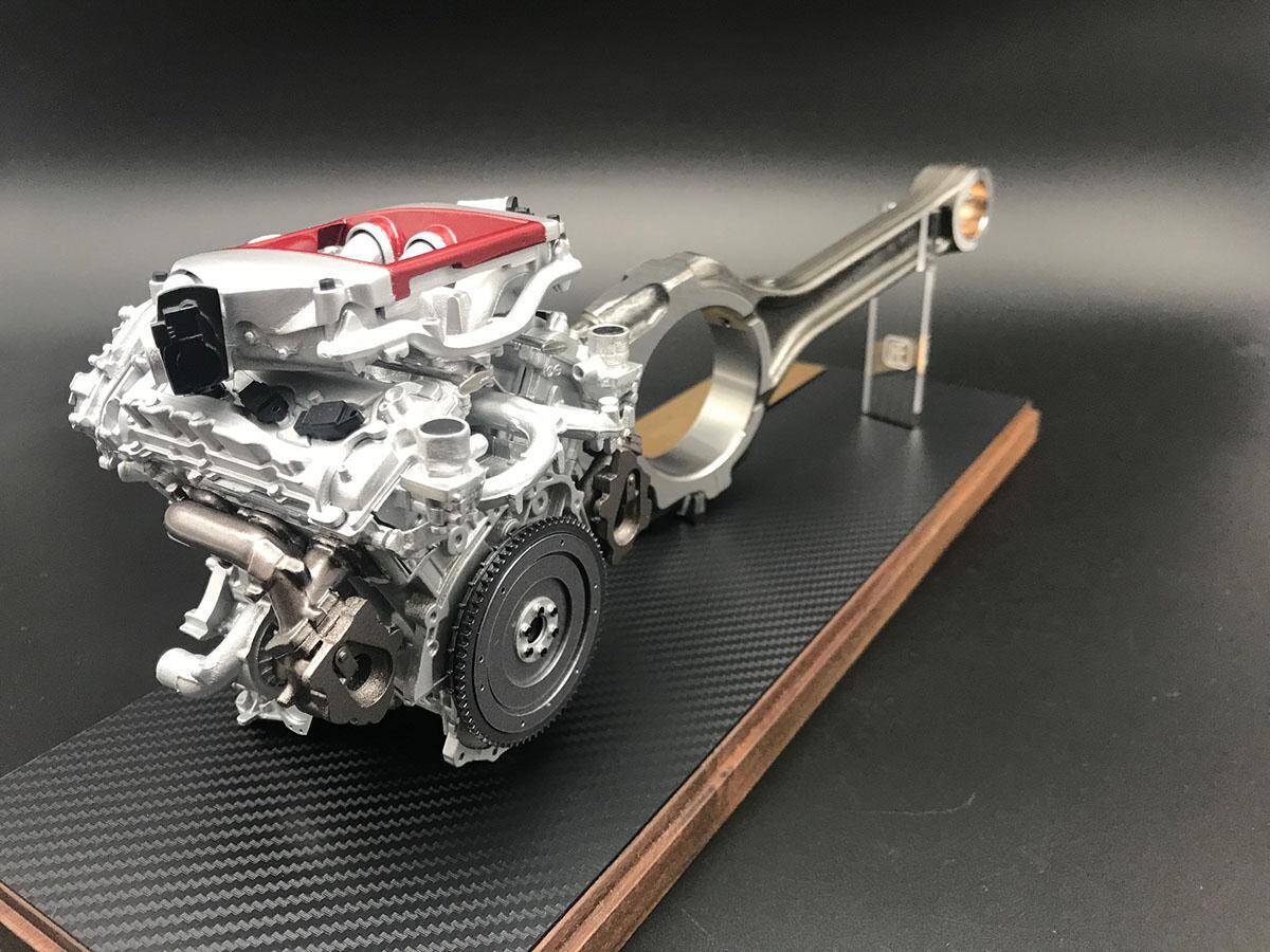 この精巧なVR38のスケールモデルに組み合わされるのが、なんと本物のVR38エンジン用コネクティングロッド。スカイラインGT-RのグループAレース用エンジンなどの開発も手掛け、VR38エンジンのパーツも製造する日産工機とのコラボレーションにより実現したスペシャルモデルとなっている。