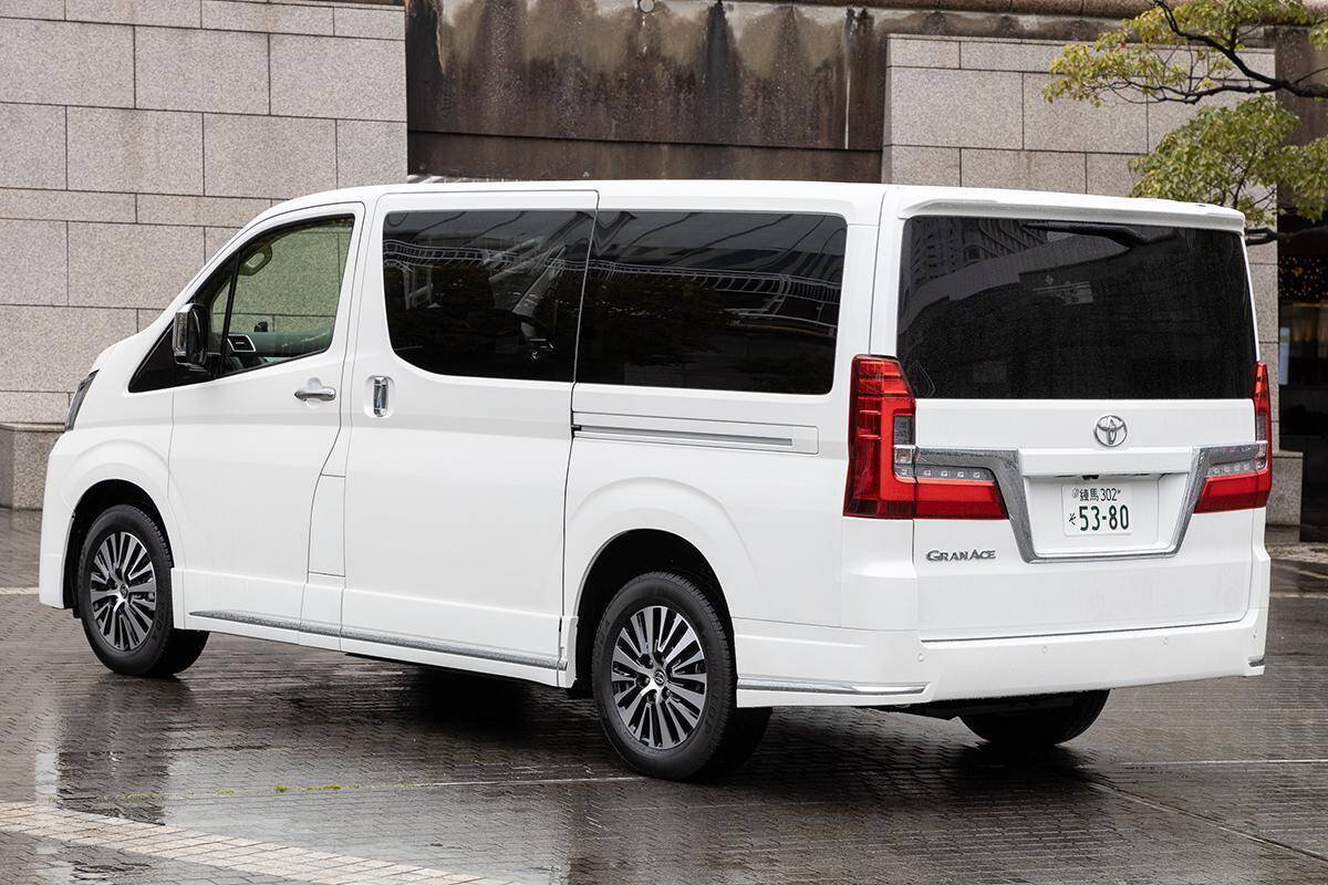 そこであらためて目を向けたいミニバンが、Lサイズのトヨタ・グランエースだ。全長は5300mm、全幅は1970mm、全高は1990mmと大柄で、車内はアルファードよりも広い。3列シートで6人乗りのプレミアムでは、2/3列目の両方に、座り心地が快適なエグゼクティブパワーシートを装着した。