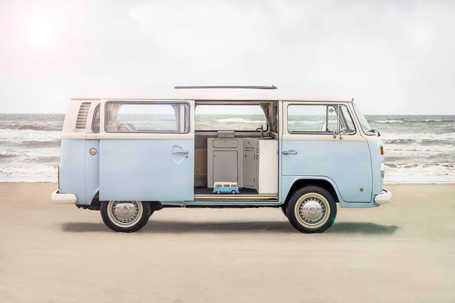 ステアリングが動くようになっているほか、室内にはオープンキャビネット、冷蔵庫、シンク、ティーポット付きのガスコンロなど、キャンピングカーでの旅行に必要なものがそろっており、まさにキャンピングカーに相応しいセット内容だ。折りたたみ式の椅子や、多くのサーファーに愛されたことを象徴したサーフボードも付属する徹底ぶり。