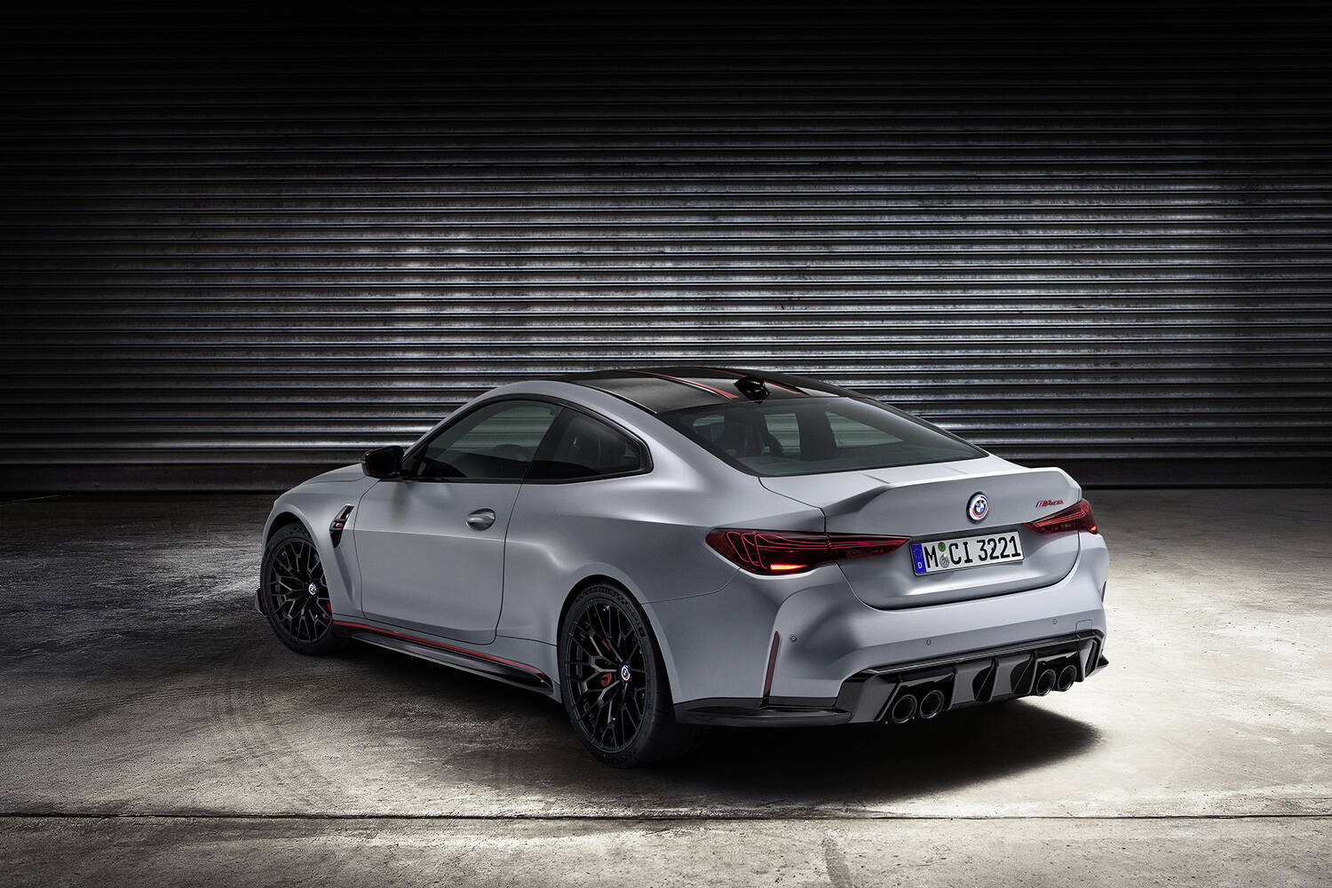 外装には、ボンネットやトランクリッド、キドニーグリルやエア・インレット、ドアミラーキャップとディフューザーなどにCFRP(炭素繊維強化プラスチック)を採用。これにより、大幅な軽量化を実現するとともに、スポーツカーとしての存在感も増している。また、イエローのデイライトを備えたレーザーライトやレーザーテクノロジーを採用したリヤコンビネーションランプ、黒をベースに赤い差し色を利かせたモデルバッチをトランクリッドなどに装備し、ベースモデルのM4とは異なる特別感のあるエクステリアを生み出している。