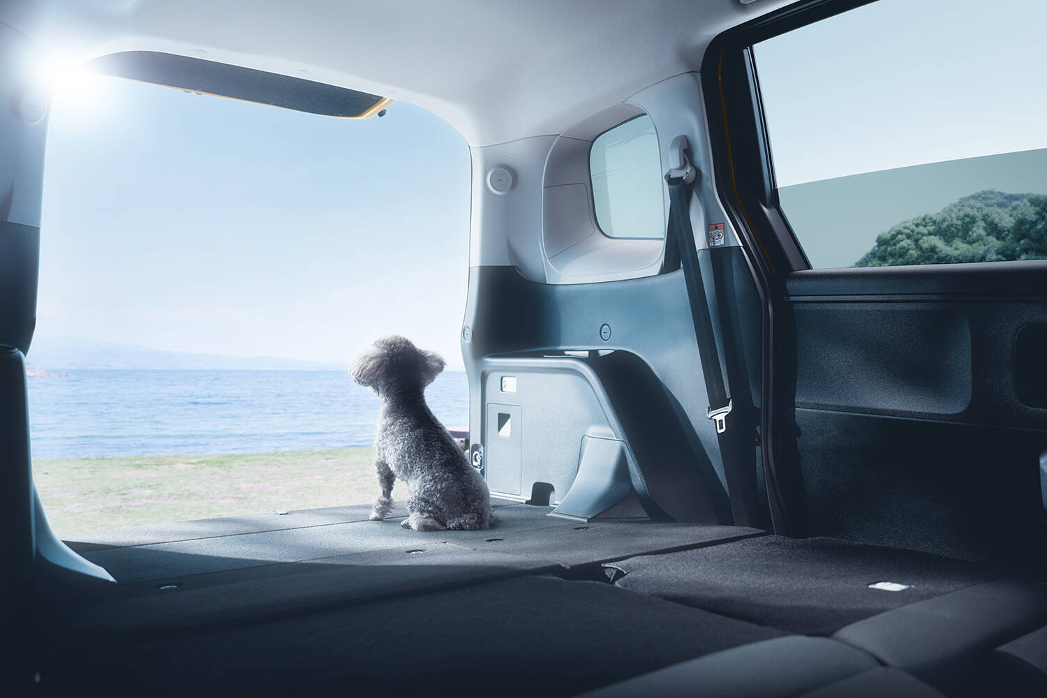 まず、愛犬の特等席となる後席の乗降性だ。スライドドアのステップ地上高は先代同様330mmと、世界の乗用車でもっとも低い部類。しかもスライドドア開口高は先代比+60mmの余裕があり、小型犬を抱いたまま乗降するようなシーンでも飼い主はより楽々、スムースに乗り降りできるのだ。室内高も先代比で+20mmだから、乗り込んでからの姿勢の自由度もUP。