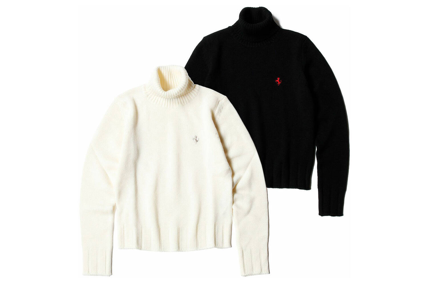 1つ目は、なんといってもあの「跳ね馬」のエンブレムに憧れる人が多い、イタリアのスーパーカーブランド、フェラーリ。サーキットのイメージが強いので、アパレルといえばウインドブレーカーやキャップくらいだけだと思っている人も多いと思いますが、じつは、フェラーリにはとってもカッコいい、大人がオシャレに着られるデニムジーンズや、タートルネックシャツ、セーターなども揃っているんです。