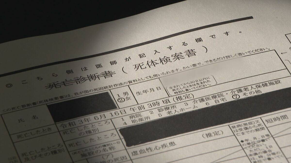 名古屋・中村区の細川外科クリニックで見せてもらったのは、“死体検案書”と書かれた書類。原因不明で亡くなった場合などに、死因を詳しく調べて作成されます。